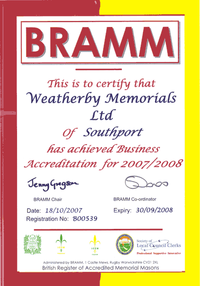 ![]() | Our certificate from the BRAMM - BRITISH REGISTER OF ACCREDITED MEMORIAL MASONS |